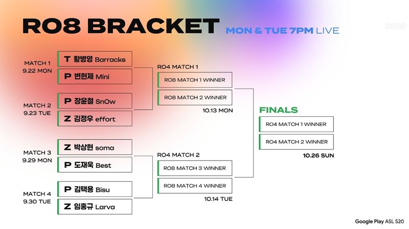 8강은 7전 4선승제로 이뤄지며 각 선수가 맵을 하나씩 선택한다. 경기는 서울 대치동 프릭업 스튜디오에서 열리며 현장 관람 티켓은 매주 목요일 오후 5시 티켓링크를 통해 선착순 예매할 수 있다. 대회 생중계와 VOD 다시보기는 SOOP e스포츠 홈페이지에서 제공된다.