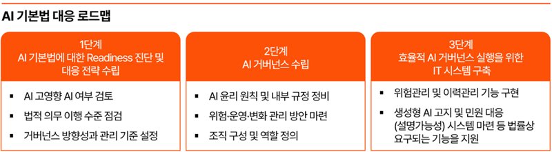 마지막으로 보고서는 AI 기본법에 효과적으로 대응하기 위한 3단계 로드맵으로 △AI 기본법에 대한 준비도(Readiness) 진단 및 대응 전략 수립 △AI 거버넌스 체계 수립 △효율적 AI 거버넌스 실행을 위한 IT 시스템 구축 등을 제시했다.