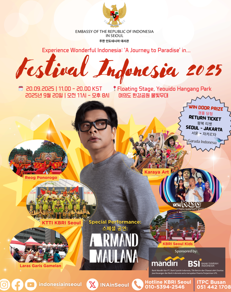 특히 인도네시아 팝의 아이콘 아르만 마우라나의 라이브 공연이 하이라이트로 펼쳐진다. 행사 참가자에게는 가루다 인도네시아 항공 서울-자카르타 왕복 항공권 등 다양한 경품도 제공된다.
