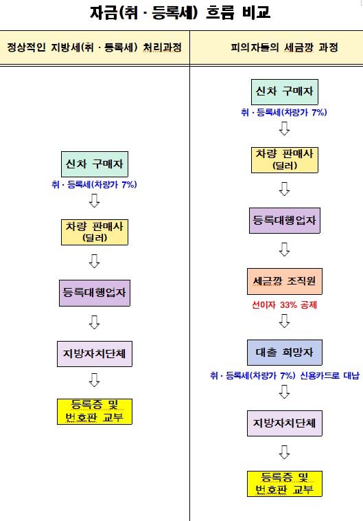신용카드 정보로 미리 도용한 차량 구매자의 자동차 취·등록세(지방세)를 대납, '세금깡'을 하고 급전이 필요한 이들에게 선이자 33%를 뗀 돈을 빌려줬다.