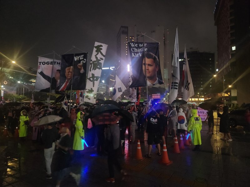 최근 피살된 미국 우파 활동가 찰리 커크 사진과 함께 "우리가 찰리 커크다"(We are Charlie Kirk)라고 적힌 깃발도 보였다.