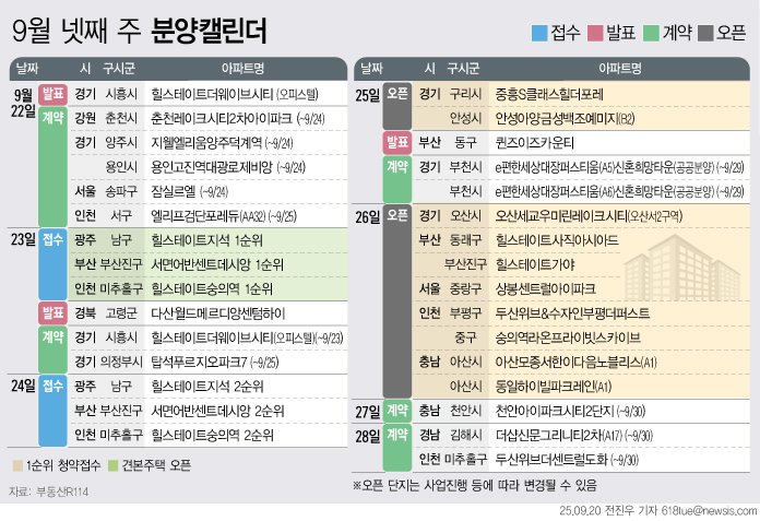 부동산R114에 따르면, 청약 일정은 인천 미추홀구 숭의동 '힐스테이트 숭의역', 부산 부산진구 부암동 '서면 어반센트 데시앙', 광주 남구 지석동 '힐스테이트 지석' 등에서 진행된다.
