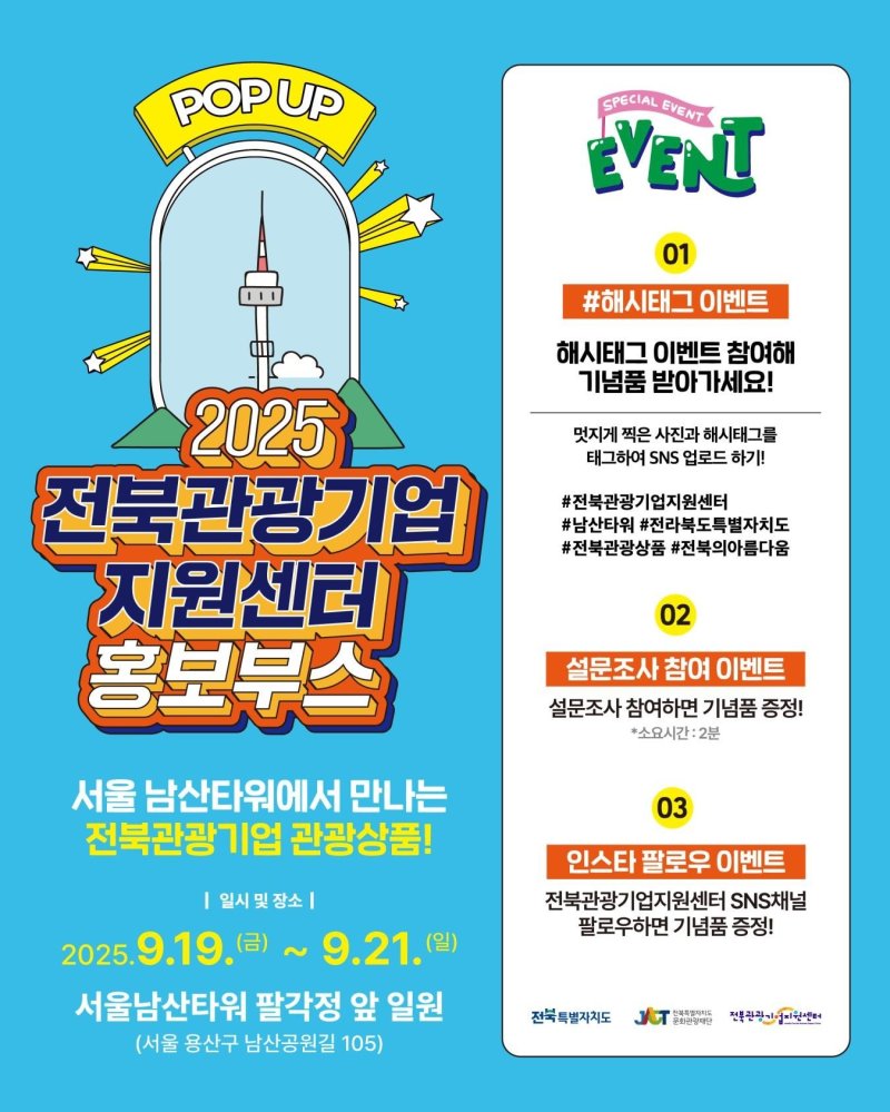 전북문화관광재단 전북관광기업지원센터는 19일부터 21일까지 3일간 서울남산타워 T1층·광장에서 전북도 관광팝업스토어와 연계한 '전북관광기업지원센터 홍보부스'를 운영한다고 20일 밝혔다.