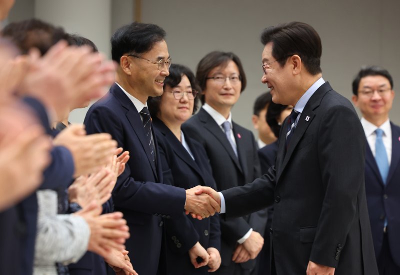 [서울=뉴시스] 고범준 기자 = 이재명 대통령이 15일 서울 용산 대통령실 청사에서 열린 임명장 수여식에서 차정인 국가교육위원장과 악수하고 있다. (대통령실통신사진기자단) 2025.09.15. bjko@newsis.com [서울=뉴시스] 고범준 기자 = 이재명 대통령이 15일 서울 용산 대통령실 청사에서 열린 임명장 수여식에서 참석자들과 기념촬영을 하고 있다. (대통령실통신사진기자단) 2025.09.15. bjko@newsis.com ◆핵심규제 합리화 전략회의