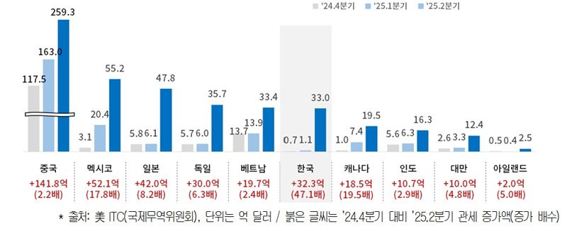 다만 트럼프 2기 출범 전인 지난해 4·4분기 관세액과 비교했을 때 우리나라의 관세 증가액은 32.3억 달러로 중국의 141.8억 달러, 멕시코의 52.1억 달러, 일본의 42억 달러에 이어 네번째로 높은 수준이었다.