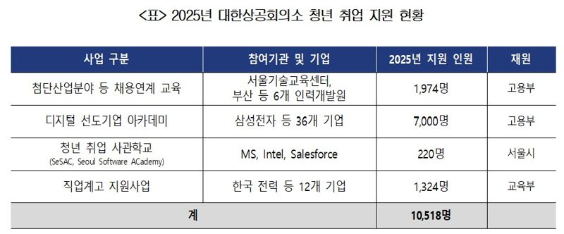 상의는 AI, 로봇, 반도체, 등 미래성장 산업 분야를 핵심 교육훈련 분야로 선정하고, 전국 7개 인력개발원, 36개 선도기업아카데미 참여기업과 함께 1만명의 첨단분야 청년 인재를 양성하여 산업현장에 취업 연계한다.