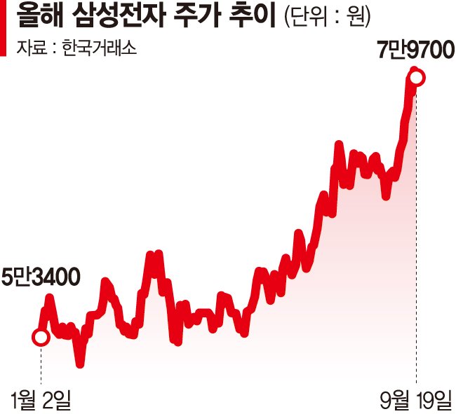 올해 상반기까지만 해도 삼성전자의 주가는 지지부진한 흐름을 보여왔다. 5세대 고대역폭메모리(HBM)인 HBM3E 12단 제품의 엔비디아 품질 테스트 통과가 지연되고, 점유율 1위를 지켜왔던 D램 시장에서도 경쟁력이 떨어지면서 주가는 5만~6만전자 사이에 갇혀 있었다.