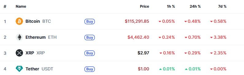 22일 오전 7시 20분 현재 글로벌 코인 시황 중계사이트인 코인마켓캡에서 비트코인은 24시간 전보다 0.05% 하락한 11만5291달러를 기록하고 있다.