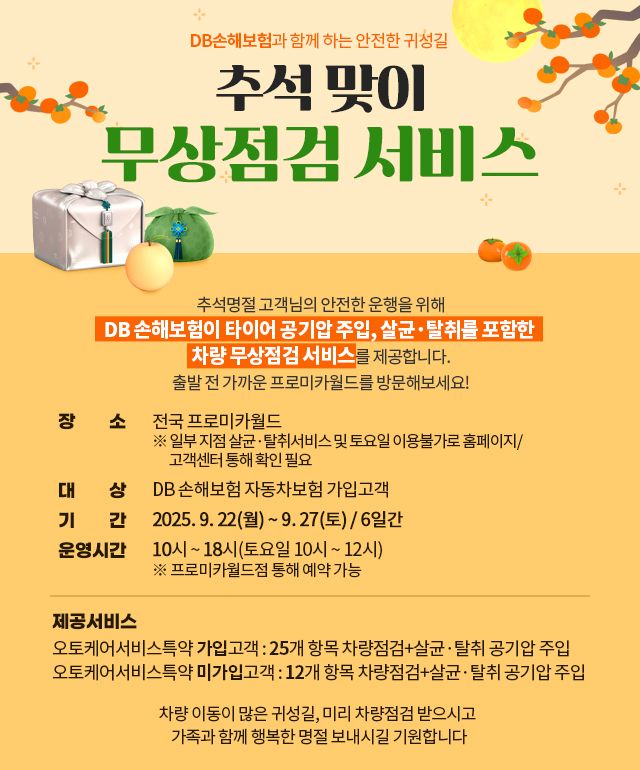 DB손해보험은 추석 명절을 대비해 고객의 안전한 운행을 지원하고 사고 예방 활동을 강화하고자 오는 27일까지 차량 무상점검 서비스를 실시한다고 22일 밝혔다.