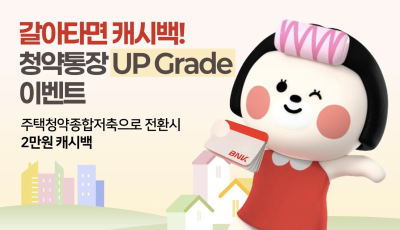 [파이낸셜뉴스] BNK부산은행은 오는 12월 15일까지 주택청약예금·부금을 주택청약종합저축으로 전환하는 고객을 대상으로 캐시백 혜택을 제공하는 ‘갈아타면 캐시백! 청약통장 업 그레이드(UP-grade) 이벤트’를 한다고 22일 밝혔다.
