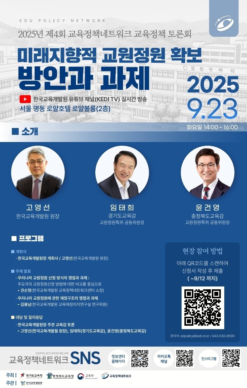 경기도교육청, 충북교육청, 교육부, 교육정책네트워크가 공동 주최하고, 한국교육개발원이 주관하는 이번 토론회는 미래 교육수요에 대응하는 교원정원제도 개편 방안을 모색하는 자리다.
