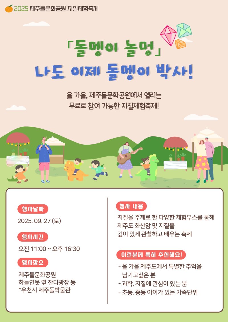 27일 행사는 '지질체험축제'로 진행한다. 제주도의 독특한 지질학적 특성을 쉽고 재미있게 체험하며 배울 수 있는 기회를 제공한다.