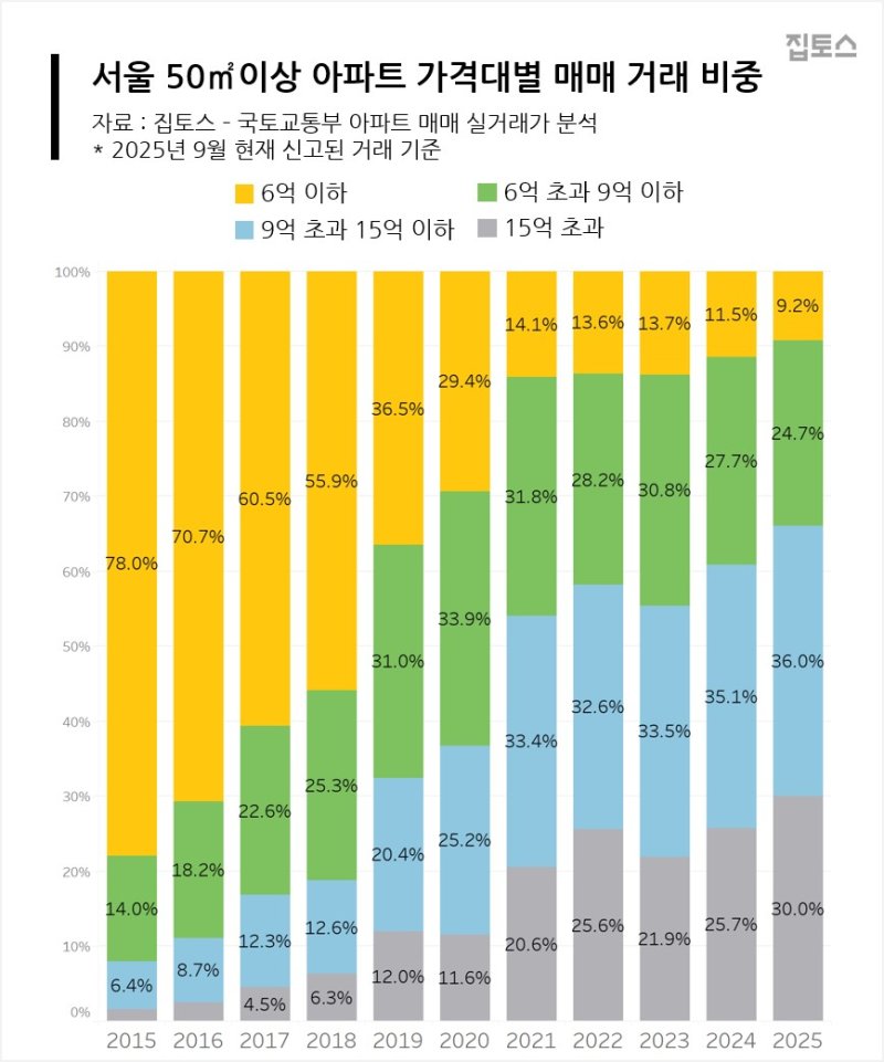 22일 부동산 중개업체 집토스는 2015년부터 올해까지 서울 아파트 매매 실거래가를 분석한 결과, 서울 전체 거래에서 6억 원 이하 아파트가 차지하는 비중이 2015년 80.5%에서 2025년 15.8%로 급감했다고 밝혔다.