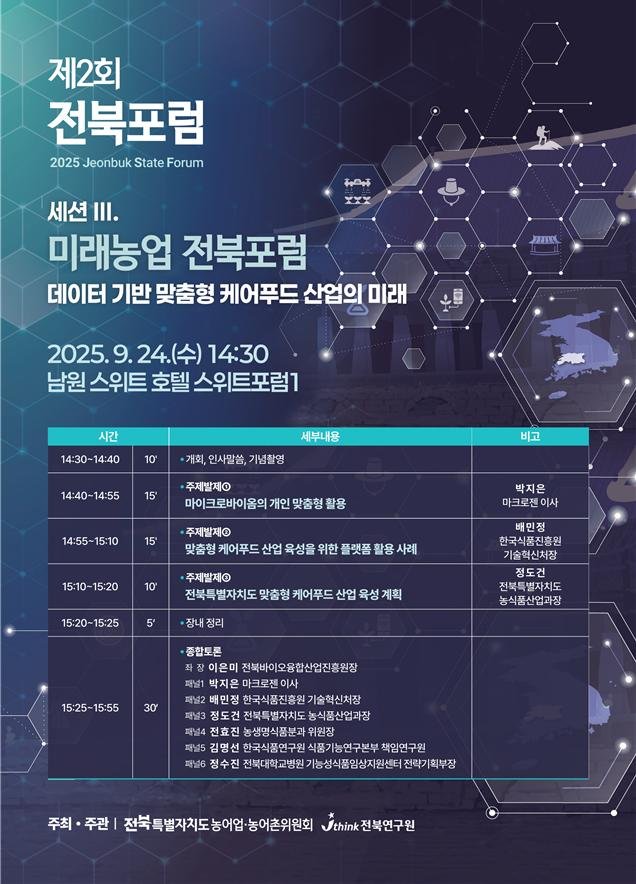 [전주=뉴시스] 김민수 기자 = 전북특별자치도는 오는 24일 남원 스위트호텔에서 '데이터 기반 맞춤형 케어푸드 산업의 미래'를 주제로 '미래농업 전북포럼'을 연다고 22일 밝혔다.
