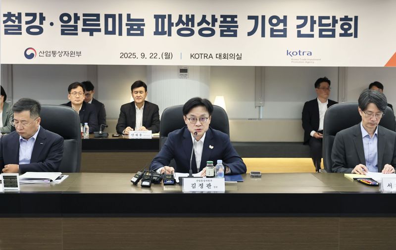 22일 김정관 산업통상부장관은 서울 코트라에서 철강·알루미늄 파생상품 기업 지원 간담회를 주재하고 이같이 밝혔다. 김 장관은 미 관세조치 애로가 큰 철강·알루미늄 파생상품 기업현장의 목소리를 경청하고 ‘관세대응 119’ 지원체계를 점검하기 위해 이날 현장방문에 나섰다.