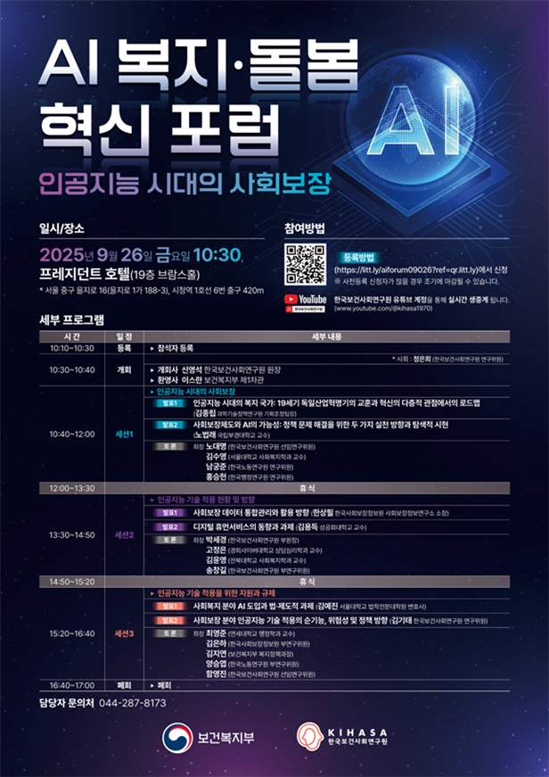 서울 중구 프레지던트 호텔에서 열리는 이번 포럼은 사회보장 분야에서 AI 기술의 활용 가능성과 정책적 과제를 논의하기 위해 마련됐다. 복지부는 올 연말까지 AI 기술 활용을 위한 돌봄 정책 등을 포함한 다양한 주제로 포럼을 이어갈 계획이다.