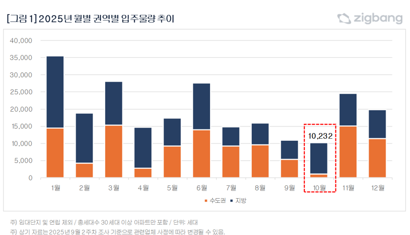 22일 직방에 따르면 10월 전국 아파트 입주물량은 총 1만232가구로, 9월 1만916가구와 비슷한 수준으로 조사됐다.