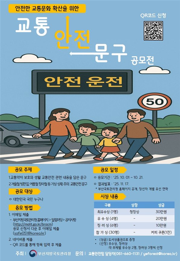 [파이낸셜뉴스] 부산지방국토관리청(청장 전형필)은 교통안전 의식·참여문화 확산, 자발적 교통안전 수칙 실천을 유도하기 위해 국민 공감과 참여 중심의 '교통안전문구 아이디어 공모전'을 연다고 23일 밝혔다.