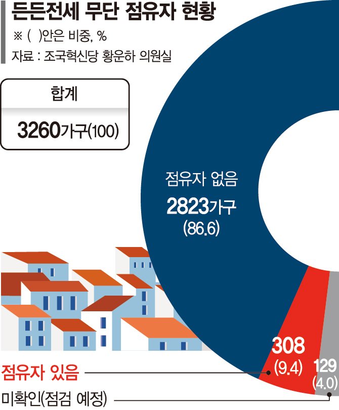 22일 국회 국토교통위원회 소속 조국혁신당 황운하 의원실이 주택도시보증공사(HUG)로부터 제출받은 자료에 따르면, 든든전세의 무단 점유자는 지난 8월 기준 전체 3260가구 중 308가구(9.4%)에 달한다. HUG가 점유를 확보한 주택은 2823가구(86.6%)이며, 점검 예정인 가구가 129곳(4.0%)이다.
