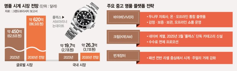 네이버 계열 리셀 플랫폼 크림(KREAM)은 시계 카테고리 강화를 위해 명품 시계 거래 수수료 면제 프로모션을 비롯해 지난 8월에는 중고 명품 거래 서비스 확대 차원에서 '롤렉스 빈티지' 카테고리를 신설했다. 번개장터는 패션 전반을 다루던 범위를 넓혀 시계와 주얼리 거래를 강화하며 대응에 나서고 있다.