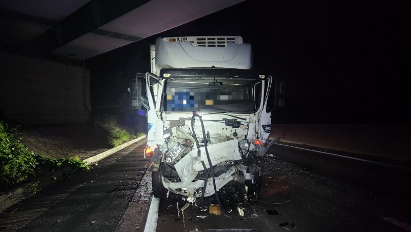 (함양=연합뉴스) 김동민 기자 = 23일 오전 3시 5분께 경남 함양군 대전통영고속도로 지곡나들목(IC) 부근 주변 대전 방향 2차로를 달리던 5.2t 트럭이 앞에 있던 4.5t 트럭을 들이받았다.