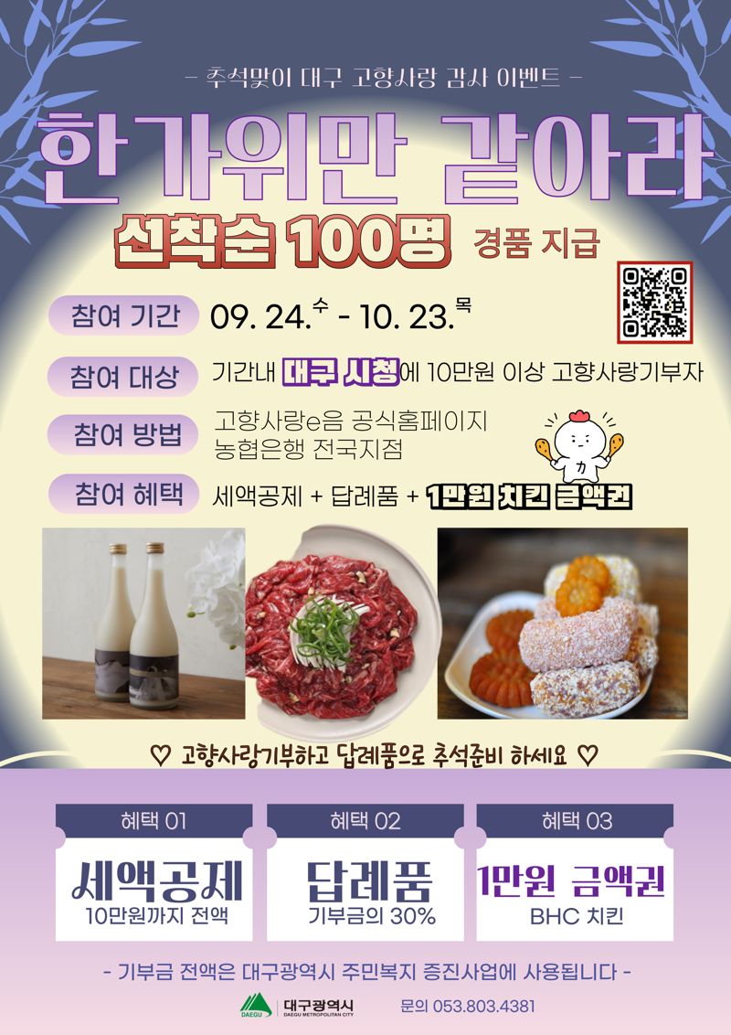 시는 민족 대명절인 추석을 맞아 고향사랑기부제 활성화와 기부 참여 확산을 위한 특별 이벤트도 마련했다. 이벤트 기간 동안 대구시청에 10만원 이상 기부한 선착순 100명에게는 1만원 상당의 치킨 금액권이 지급된다.