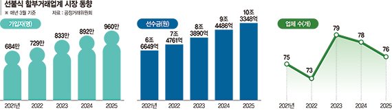 공정거래위원회에 따르면 올해 8월 기준 정상 영업 중인 상조업체는 77곳이다. 코웨이라이프솔루션에 이어 최근 '아정당'을 운영하는 아정네트웍스가 아정라이프케어를 설립, 상조시장에 참전했다. 올해 3월 말 기준 가입자는 960만명, 선수금 규모는 10조3348억원으로 전년 대비 각각 7.6%, 9.4% 증가했다.