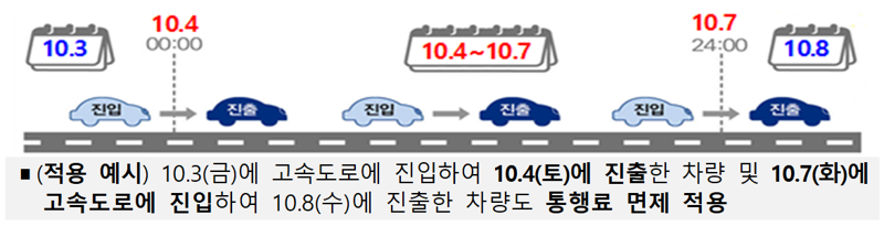 통행료 면제는 10월 4일 0시부터 7일 24시까지 잠시라도 고속도로를 이용하는 모든 차량에 적용된다.