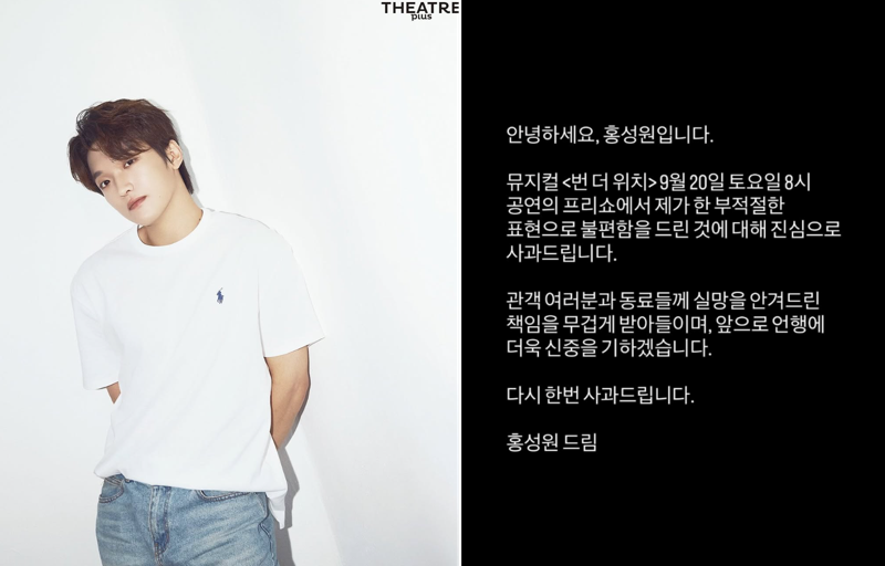홍성원은 22일 자신의 소셜네트워크서비스(SNS) 인스타그램 계정에 "뮤지컬 '번 더 위치' 공연의 프리쇼에서 (저의) 부적절한 표현으로 불편함을 줘 진심으로 사과드린다"며 "관객과 동료들께 실망을 안겨 책임을 무겁게 받아들인다. 앞으로 언행에 더욱 신중을 기하겠다. 다시 한 번 사과드린다"는 글을 올렸다.
