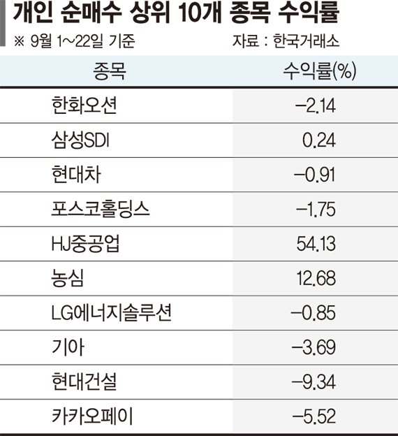 23일 한국거래소에 따르면 이달(1~22일) 개인의 순매수 상위 10개 종목 가운데 주가가 오른 종목은 3개에 불과했다. 개인의 평균 주가 수익률은 4.28%로, 같은 기간 코스피 상승률(8.87%)에 크게 못 미쳤다. 그나마 순매수 5위인 HJ중공업이 54.13% 급등하며 전체 수익률을 떠받쳤다.