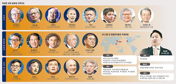 재계는 SK그룹이 십수년간 쌓아온 글로벌 인맥에 주목하고 있다. 한국 재계에서 백악관 인사 등 현직 미국 정부 장관급 인사, 일본 외무상 등 일본 정부 고위 관료, 노벨상 수상자 등 세계적인 석학을 한 방에 불러 모을 수 있는 기업은 SK 정도뿐이라는 얘기가 나온다. 그룹 싱크탱크인 최종현 학술원의 대표적인 학술행사인 트랜스 퍼시픽 다이얼로그(TPD)가 대표적 예다. 각국 정관계 인사부터 빅테크, 학계 등 광범위한 글로벌 네트워크망을 구축했다는 평가가 나온다. 최근엔 손정의(손 마사요시) 일본 소프트뱅크그룹 회장, 빌 게이츠 게이츠재단 이사장(MS 창업자), 샘 올트먼 CEO, 사티아 나델라 CEO, 젠슨 황 CEO 등과 AI, 반도체 등을 중심으로 협력의 고리를 확대하고 있다. SK그룹이 아마존웹서비스(AWS)와 함께 추진 중인 AI 데이터센터 프로젝트 역시 그의 AI 구상과 글로벌 리더십이 사업화된 대표 사례로 꼽힌다. 재계 관계자는 "이번 CEO 서밋도 최 회장의 이러한 글로벌 연대와 AI 비전을 재확인하는 무대가 될 것"이라고 말했다.