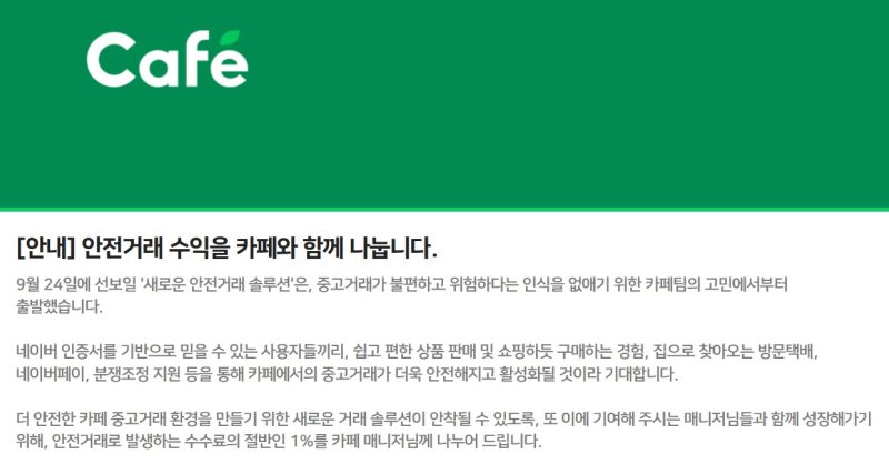 네이버는 솔루션 정식 출시 전 카페 매니저들을 대상으로 공지를 통해 카페 활성화와 안전거래 문화 조성을 위한 수익 분배 모델을 공개했다. 새로운 안전거래 솔루션 수수료는 오픈 혜택 기준 2%로 이 중 절반인 1%가 카페로 지급된다.