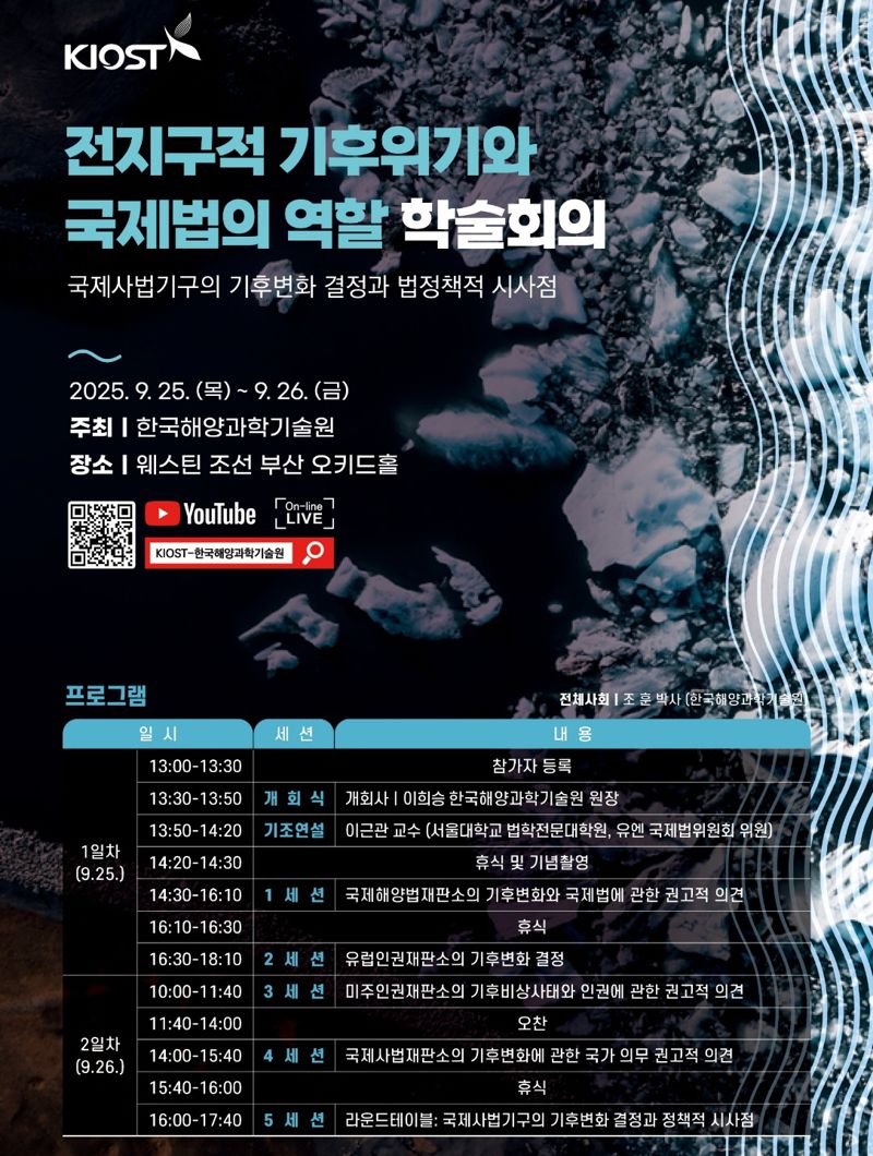 한국해양과학기술원(KIOST)은 오는 25일부터 26일까지 웨스틴 조선 부산 호텔에서 ‘전 지구적 기후위기와 국제법의 역할’ 학술회의를 개최한다고 24일 밝혔다.