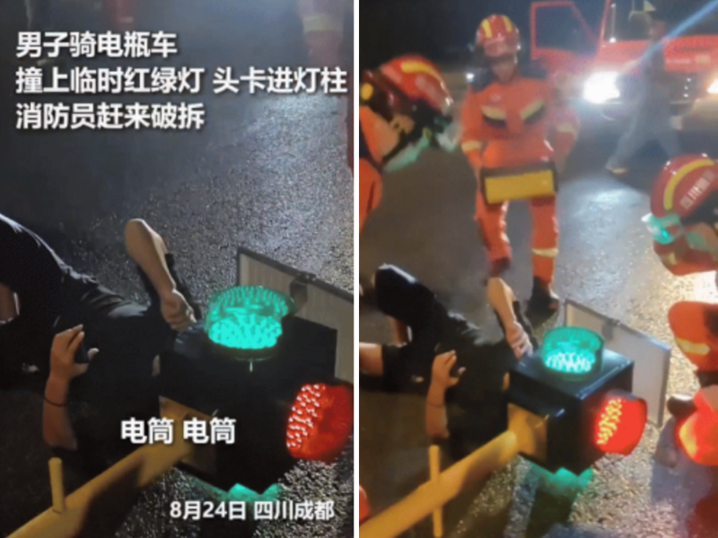 [파이낸셜뉴스] 중국의 한 남성이 헬멧도 쓰지 않은 채 오토바이를 타고 달리다 충돌한 신호등에 머리가 끼이는 황당한 사고가 발생했다.