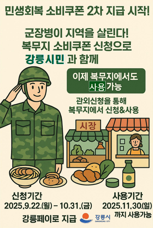 박찬영 강릉시 경제진흥과장은 “군 장병이 복무지인 강릉시에서 신청하면 소비쿠폰을 강릉에서 사용할 수 있어 가뭄으로 지친 소상공인에게 조금이나마 도움이 될 것으로 기대한다”고 말했다.