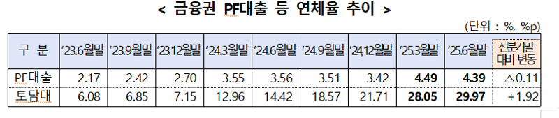 올해 상반기인 6월 말 기준 부동산PF(118조9000억원)의 연체율은 4.39%로 전분기보다는 0.11%p 하락했다. 부동산PF 연체율은 지난 2023년 말 2.70%에서 지난해 말 3.42%, 지난 3월 말 4.49%까지 치솟았다. 금융당국은 금융권 부실정리 등 영향으로 연체율이 소폭 하락했다고 설명했지만, 부동산 PF연체율은 여전히 4%대를 유지하고 있다.