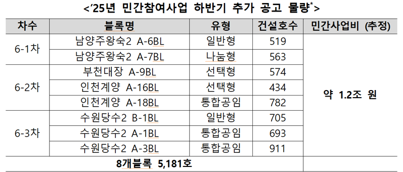 하반기에는 남양주왕숙2 등 3기 신도시를 포함한 총 4개 지구 8개 블록에서 5181가구(1조2000억원) 규모 사업이 추가로 시행된다. LH는 10월 민간사업자 공모를 진행해 연내 사업자를 확정하고, 2026년 6월 착공을 목표로 후속 절차를 밟을 예정이다. 이번 사업은 민간사업 공사비를 지급 보장하는 도급형 방식으로 추진돼 안정성이 높다는 점이 특징이다.