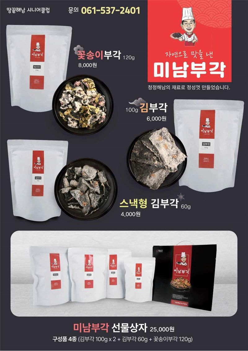 기획전 주요 상품은 △여수시니어클럽의 김치류 △순천시니어클럽의 손질멸치·누룽지세트 △고흥시니어클럽의 참깨 누룽지 △보성시니어클럽의 녹차 기름 세트 △완도시니어클럽의 김·유자사과 주스 세트 등이다. 온라인뿐만 아니라 오프라인 판매처를 통해서도 구입할 수 있다.