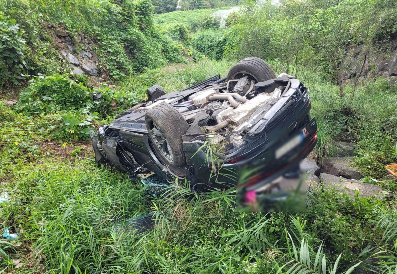 [부산=뉴시스] 이아름 기자 = 25일 오전 3시께 부산 기장군 철마면 홍연폭포 입구 도로에서 스포츠유틸리티차량(SUV)이 가드레일을 들이받고 약 6m 높이 하천으로 떨어진 뒤 전복됐다.