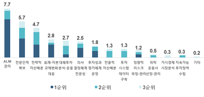설문조사 응답자들은 보험사의 미래 경쟁력 강화를 위해 ALM 및 듀레이션 매칭 능력, 전문 인력 확보, 전략적 자산배분 능력이 반드시 필요하다고 답했다. 당면한 운영상 어려움으로 '회계·자본규제 변화 대응'이 가장 많이 꼽혔다.