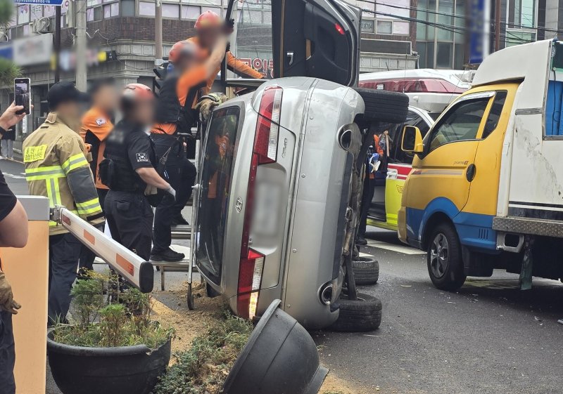 넘어진 차량에 갇혀 있던 A씨와 동승자는 119 대원의 도움을 받아 빠져나왔다.