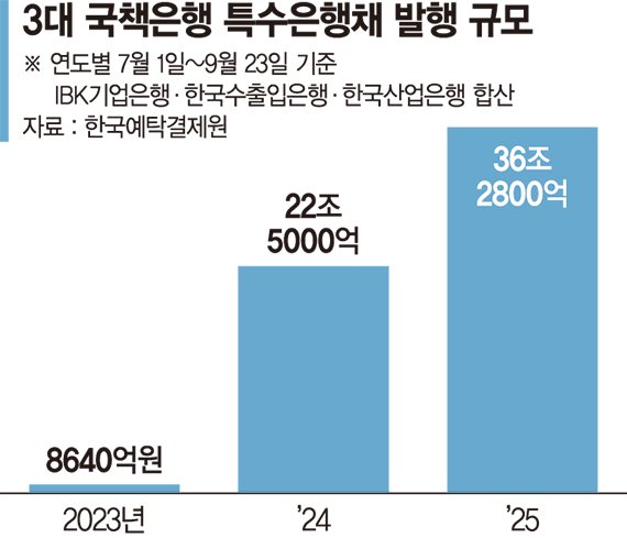 25일 한국예탁결제원 증권정보포털 세이브로에 따르면 IBK기업은행, 한국수출입은행, 한국산업은행 등 3개 국책은행이 올해 하반기 들어 이달 23일까지 발행한 특수은행채 규모는 36조2800억원으로 집계됐다. 전년동기(22조5000억원) 대비 61.2% 증가한 수치다. 지난 2023년 같은 기간(8640억원)과 비교하면 42배 가까이 커졌다.