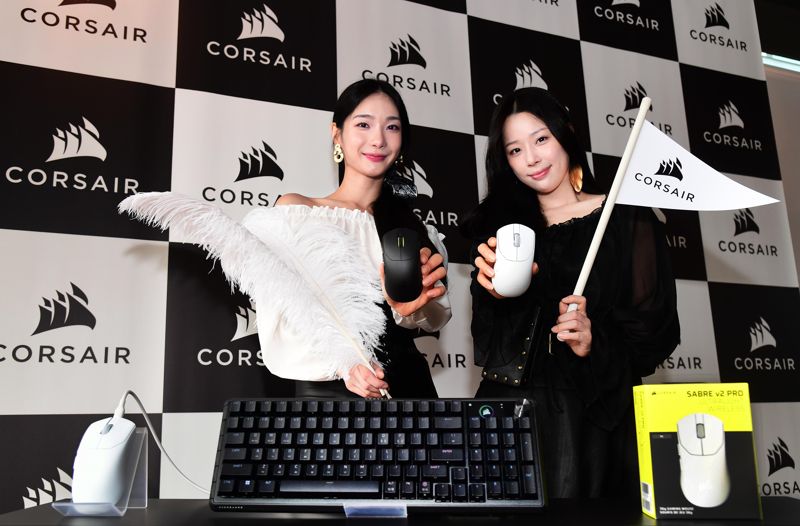 게이머, 크리에이터, PC 빌더를 위한 고성능 PC 부품의 글로벌 선도 기업인 커세어는 프로게이머들이 설계한 36g의 깃털처럼 가볍고 빠른 ‘세이버 v2 프로 울트라 라이트 무선 게이밍 마우스’를 출시, 프로게이머이자 인플루언서인 류제홍과 버니버니가 마우스를 들고 포즈를 취하고 있다.