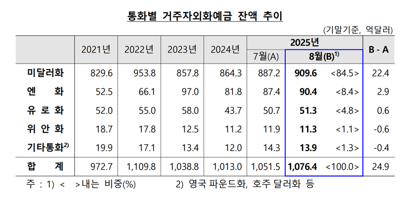 26일 한국은행이 발표한 '2025년 8월 중 거주자 외화 예금 동향'에 따르면 지난달 국내 거주자 외화예금은 1076억4000만달러로 집계됐다. 한 달 전보다 24억9000만달러 증가한 것으로 한 달 만에 상승 전환이다.