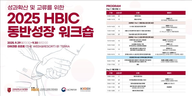 고려대학교 구로병원 개방형실험실 운영사업단은 오는 29일부터 30일까지 1박 2일 일정으로 '2025 HBIC 동반성장 워크숍'을 개최한다고 26일 밝혔다.