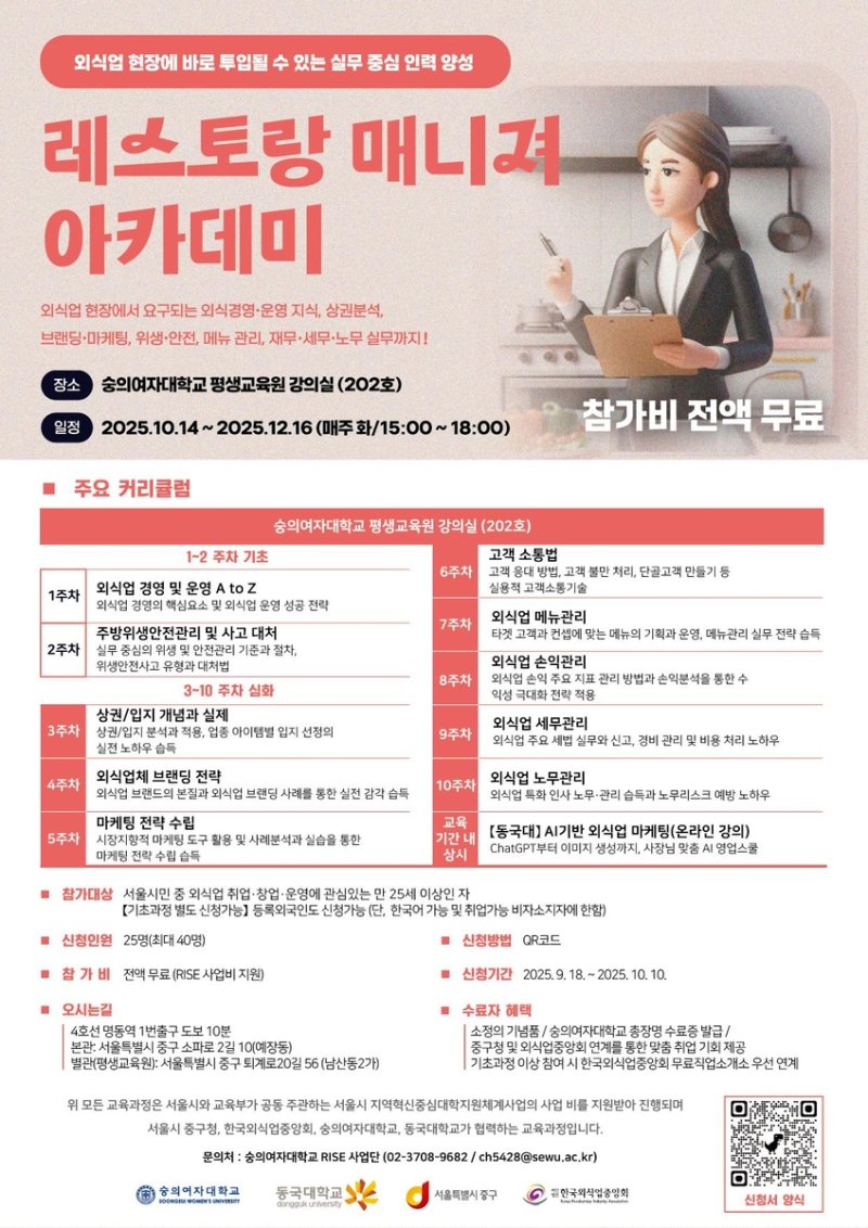 외식업 특화 직무양성과정은 10월 14일부터 12월 18일까지 숭의여자대학교에서 진행된다. 숭의여대·동국대 RISE사업단과 함께 설계한 맞춤형 교육과정이다.