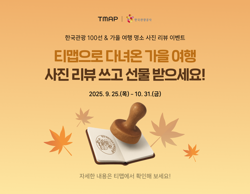 한국관광공사와 함께 하는 ‘한국관광 100선’ 방문 인증 이벤트는 ‘어디갈까’에서 제공되는 ‘한국관광 100선’ 중 목적지를 설정하고 이동하면 된다. 한국관광공사가 선정한 대표 관광지 현장에서 스탬프를 찍고, 티맵의 장소 리뷰 메뉴에서 인증 사진을 올리면 된다.