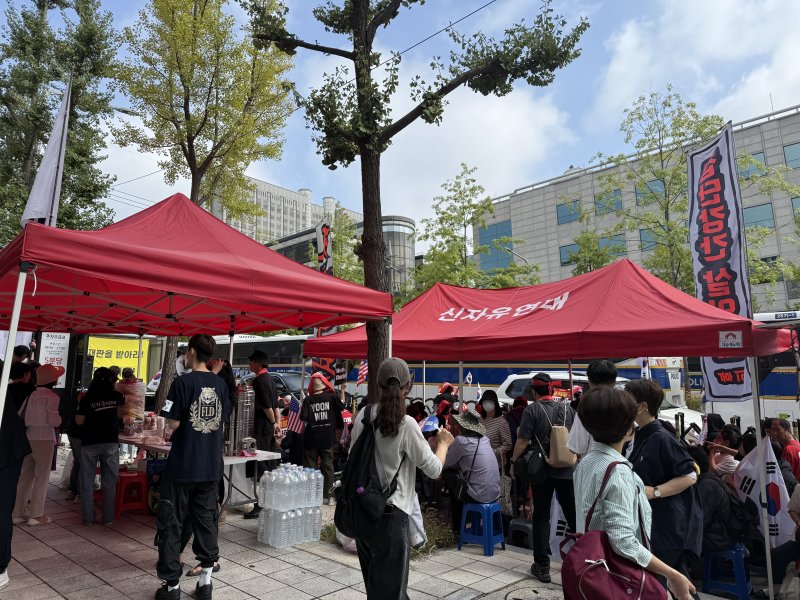 [서울=뉴시스]최은수 이수린 수습 기자 = 윤석열 전 대통령의 특수공무집행방해 혐의에 대한 첫 공판이 열리는 26일 오전 서울중앙지법 인근 곳곳에서 지지자들이 모여들었다.