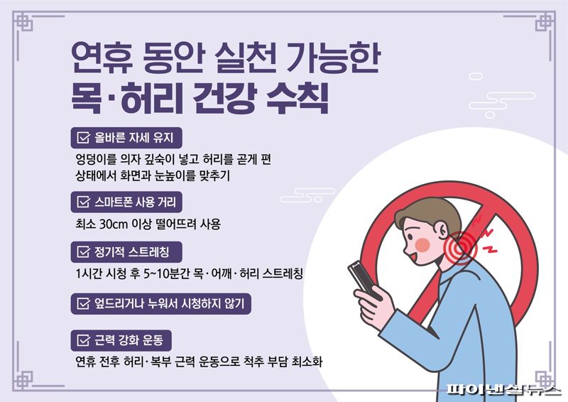 바른세상병원 척추센터장 이학선 원장(신경외과 전문의)은 "연휴 동안 누워서 장시간 TV나 스마트폰을 시청하면 허리와 목에 불필요한 부담을 주기 때문에 대신 의자에 앉아 시청할 때는 엉덩이를 의자 깊숙이 넣고 허리를 곧게 편 상태에서 화면을 눈높이와 맞추는 것이 중요하다"면서 "가능하다면 1시간 시청 후에는 5~10분 정도 일어나 몸을 움직이거나 목ㆍ어깨 스트레칭이나 가벼운 걷기는 해주는 것이 도움이 된다"고 조언했다.