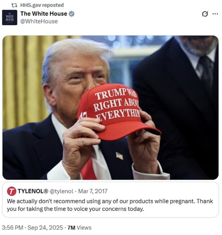 백악관은 공식 트위터 계정을 통해 지난 24일 '도널드 트럼프 대통령이 모든 점에서 옳았다(Trump Was Right About Everything)'라고 적힌 모자를 들고 있는 사진과 함께 2017년 타이레놀 트윗을 함께 올렸다.